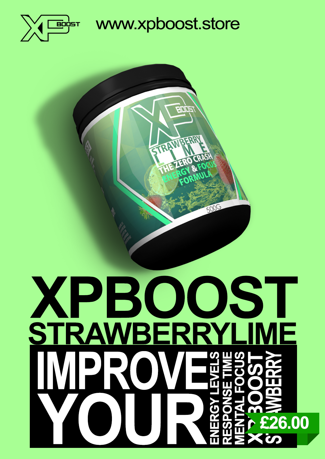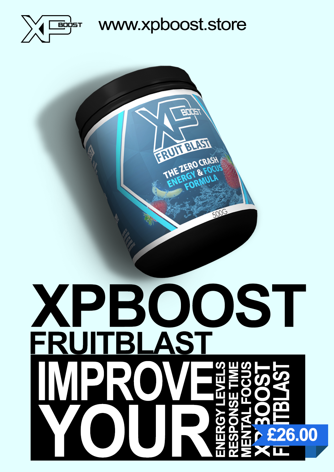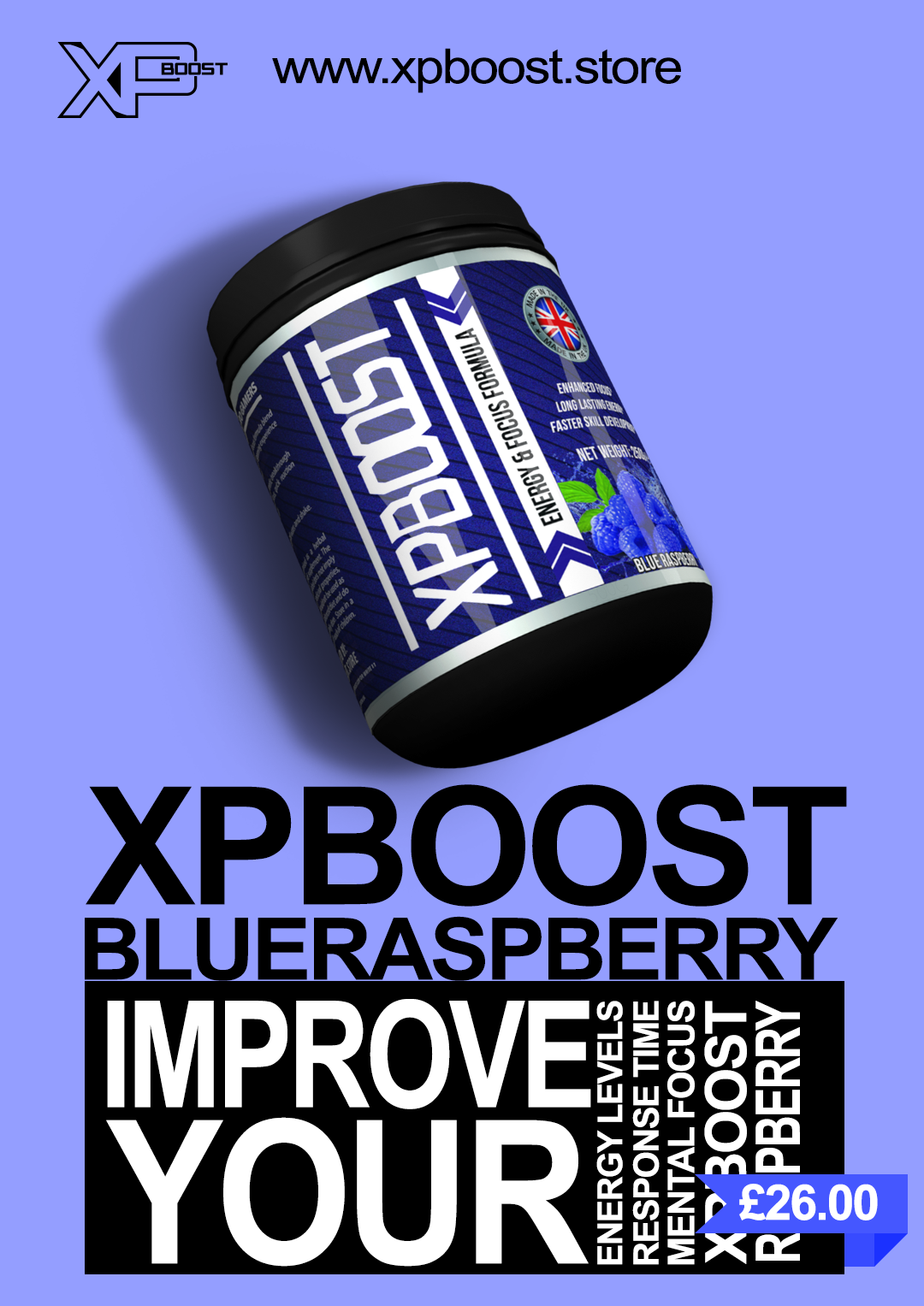 XPBoost is a company based in the UK. They target their sales of "Energy & Focus Formula" towards the video game audience. I was tasked with creating a banner for the XPBoost twitter account, as well as labels and advertisements for their products.